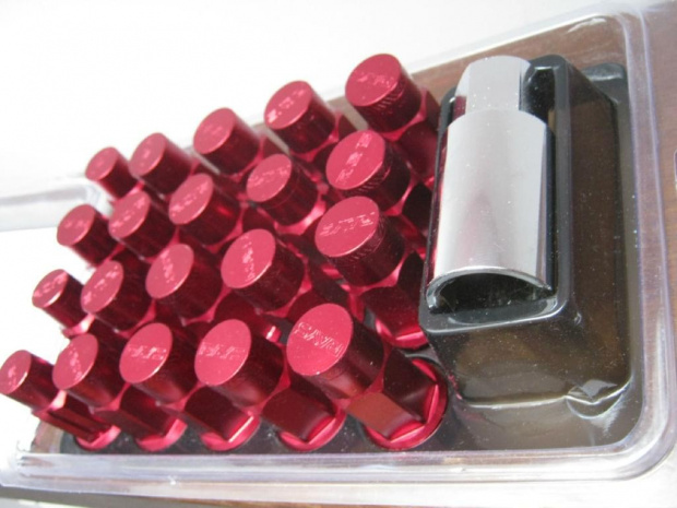 Nakrętki czerwone z logo Rays M12x1,5, 16 nakrętek zwykłych + 4 zabezpieczające